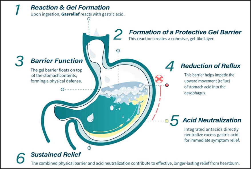 • Acción física dirigida: A diferencia de los supresores de ácido que actúan sistémicamente, Gasrelief actúa localmente en el estómago, proporcionando una barrera física contra el reflujo.